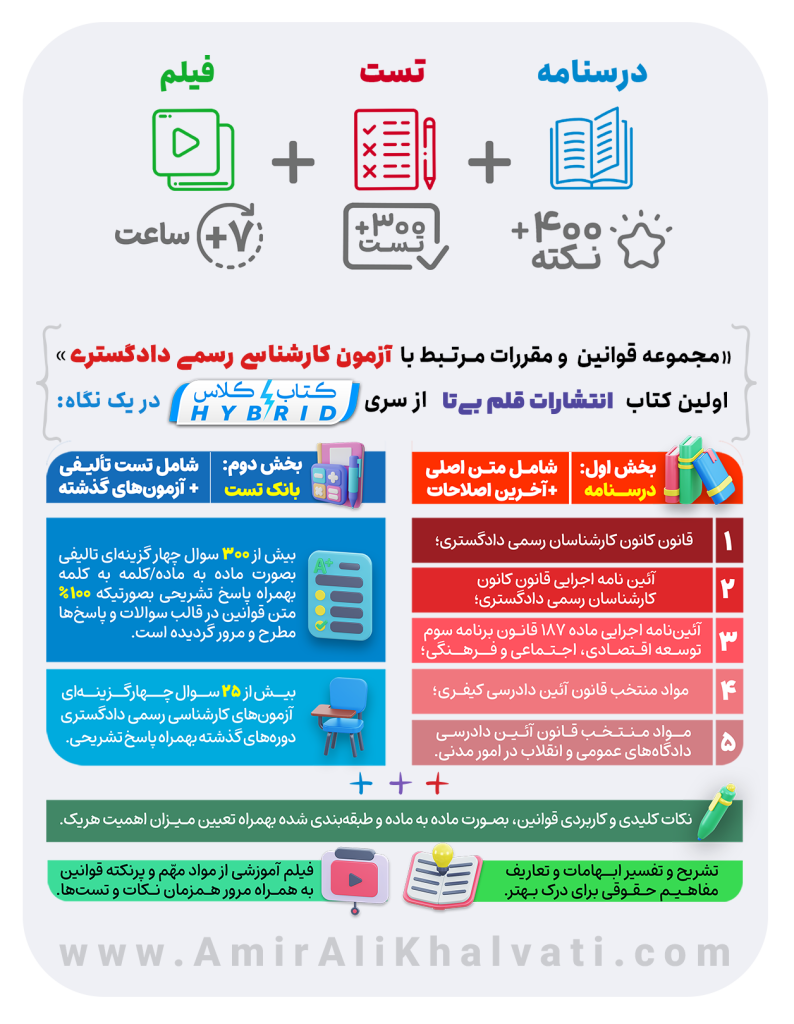 جلد اول کتاب-کلاس از مجموعه کتب انتشارات قلم بی تا جهت آمادگی آزمون کارشناسی رسمی، با عنوان “مجموعه قوانین و مقررات مرتبط با کارشناسان رسمی دادگستری” می باشد که برای اولین بار در کشور بر اساس شیوه ای جدید بصورت ترکیبی از کتاب و فیلم آموزشی تالیف و تدوین گردیده است.